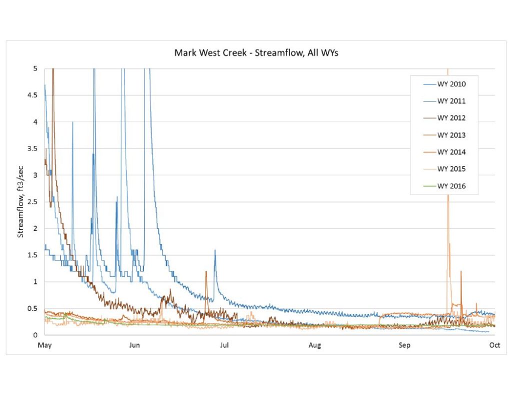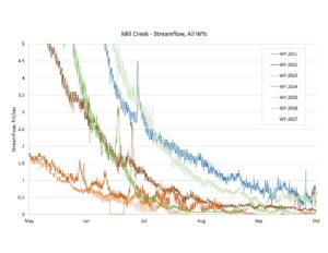 Trout Unlimited’s Conservation Hydrology team (formerly CEMAR), studied the relationships between streamflow conditions and human water use in five project watersheds in Sonoma County since 2010. In the first few years of our work, we investigated the magnitudes, timing, and frequency of high and lows flows in each project watershed to characterize the flow regime of each stream. In more recent years, TU’s work focused on studying low flow conditions during the summer dry season, to investigate the impacts of the recent drought and how water management practices influenced streamflow conditions. Additionally, TU streamflow data was used by our partners to study the timing of significant biological thresholds, such as pool connectivity and over-summer survival.